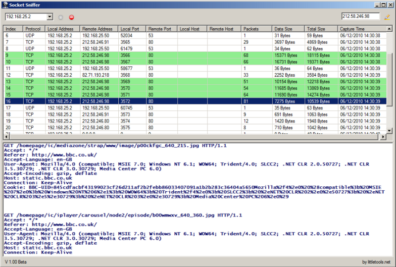 SocketSniffer allows you to capture TCP/IP packets that pass through your network adapter and view the captured data as a sequence of conversations between clients and servers. You can view the TCP/IP conversations ASCII mode for text-based protocols, like HTTP, SMTP, POP3 or as hex dump for non-text base protocols