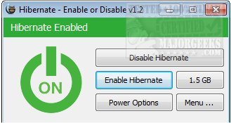 Utilizing Sordum Hibernate Enable or Disable is quite simple; run it and choose to enable or disable hibernation. The app shows the status of the hibernation settings as well as the size and location of your hibernation file if enabled, and you can additionally change the size of the hiberfil.sys file via the size button with options.