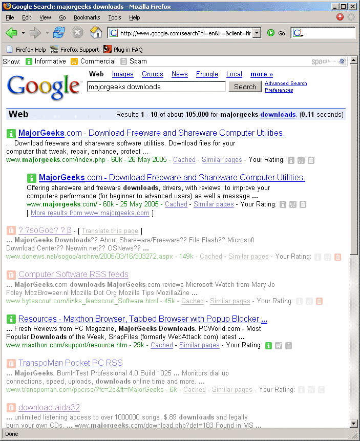 Spacilus, helps you by using Bayesian statistics to categorize search results. Put simply, Bayesian classification looks at the joint probabilities of a search results words and phrases to belong to a certain category. For example, a search result that contains a phrase like "price comparison" will most likely belong to a category "Commercial" or "Spam" rather than to a category "Informative".