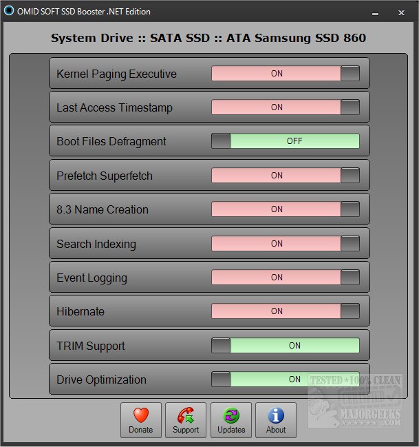 It provides you with slider-type options for optimizing and tweaking Windows for SSD. The UI is not modern and fancy, but what it lacks in polish, it makes up for in function. There are a total of ten options and include TRIM support, Driver Optimization, Search Indexing, Event Logging, etc. Slide the corresponding switch on/off for the option you wish to utilize. There is also (not shown in the screenshot) a tab to pull system info.