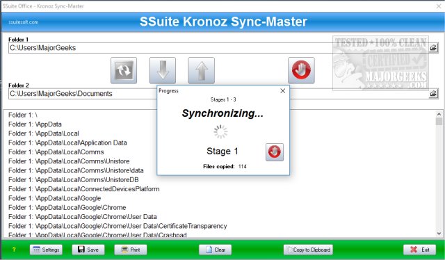 During the transfer, you are shown the stages of completion and how many files have been copied. You can remove your selections anytime or copy to the clipboard. Of course, you can also save or print your settings at any time. Settings allow you to select the original two folders that you might want always to synchronize.