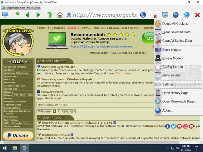 SSuite NetSurfer Web Browser is capable of blocking social media and site trackers as well as cookie management. It also includes a private mode function that provides complete data collection and tracking protection.