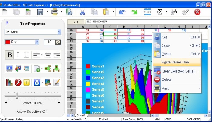 Use SSuite QT Calc Express' chart wizard to select from over eight 2-D and 3-D chart categories, including line, area, column, pie, XY, stock, and dozens of variants. With a few mouse clicks, you can reorganize your spreadsheet to show or format ranges according to special conditions or quickly calculate subtotals and totals. QT Calc lets you present spreadsheet data in dynamic charts that update automatically when the data changes.