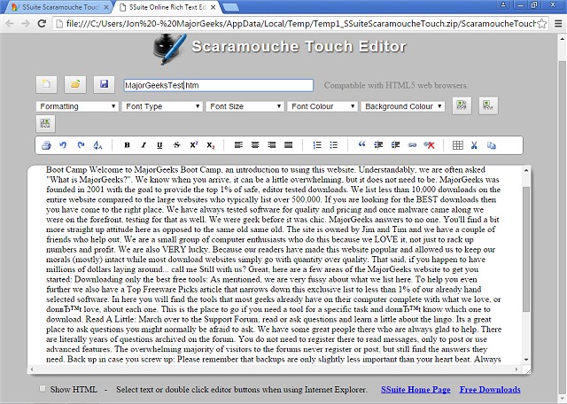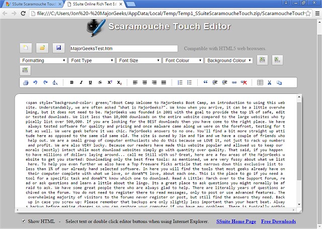 SSuite - Scaramouche Touch is a lightweight but full-featured text editor that allows for the opening, editing, and saving of .HTML documents and more.