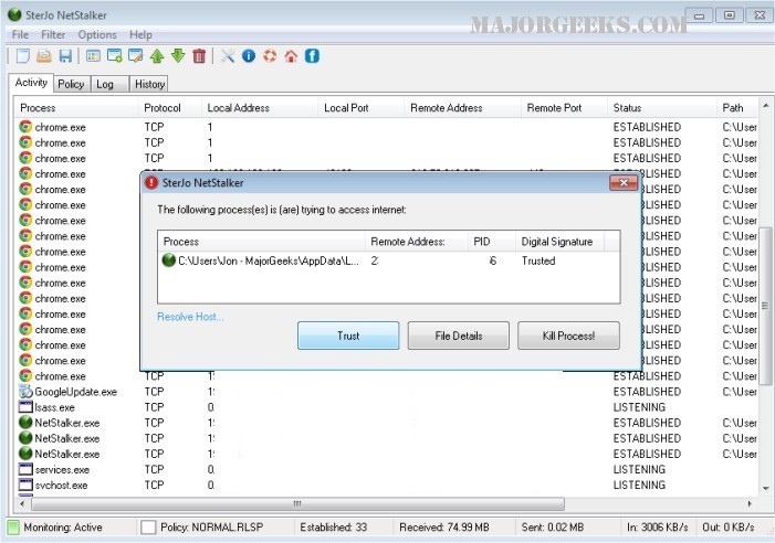 An easy-to-read status bar will inform you about all these connections' activities. If this internet traffic monitor notices any suspicious process that could be harmful to your PC's security, a window will pop up, allowing you to quit the process and destroy it.