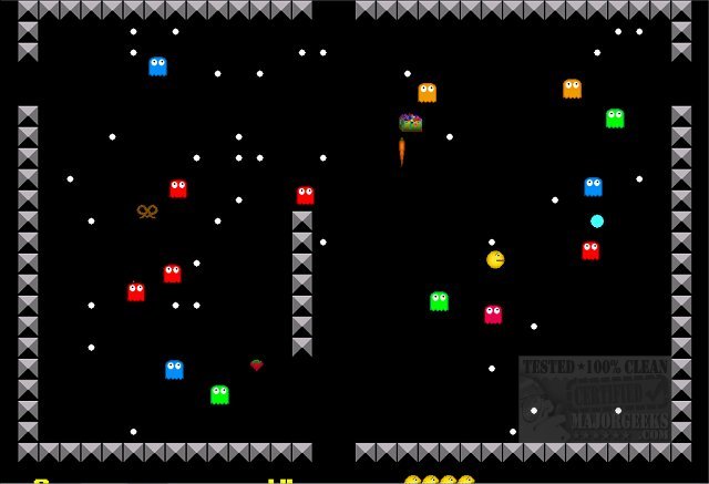 Super Pac Munch has extra points you can achieve by gobbling up the random food items as well as treasure bonuses. It features background music, sound effects, cute graphics, and high score tracking. If the time runs out, you will get penalized. A fun little game to play that is close enough to the classic but different enough to be fresh and interesting.
