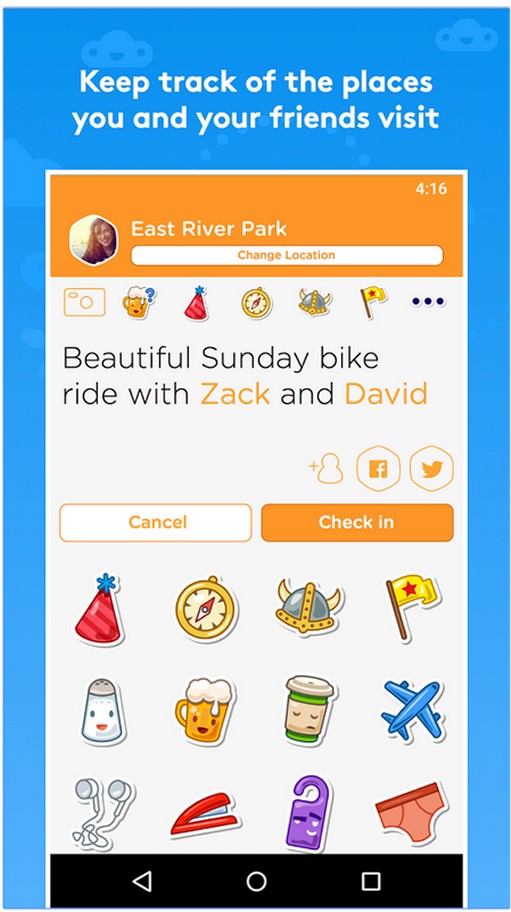Keep track of where you’ve been and who you’ve hung out with. After you check in we’ll show you interesting little insights like: “That’s 5 weeks in a row at bars!” or “That’s your 25th time hanging out with Courtney!”
