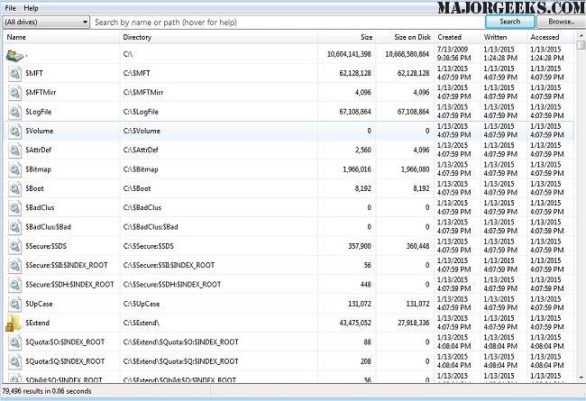 Typical searches yield full results in ~10 seconds or less, a significant speedup for many users. As a bonus, this program also supports path-based search (for example, you can search for "*Program*Windows*"), regular expressions (just start the search name with '>' character), and full directory sizes. Its goal is to be simple, swift, and intuitive to use.
