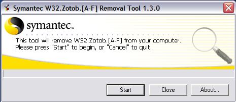 Symantec W32.Zotob Free Removal Tool is designed to remove W32.Zotob infections including W32.Zotob.A, W32.Zotob.B, W32.Zotob.C@mm, W32.Zotob.D, W32.Zotob.E and W32.Zotob.F.