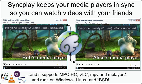 Syncplay synchronizes the position and play-state of multiple media players so that the viewers can watch the same thing simultaneously. This means that when one person pauses/unpauses playback or seeks (jumps position) within their media player, this will be replicated across all media players connected to the same server and in the same 'room' (viewing session). When a new person joins, they will also be synchronized.