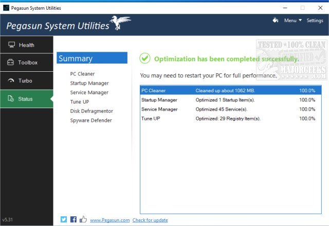Pegasun System Utilities is a complete computer care package! This program will clean, speed up, maintain, secure, and repair your system so that it runs like new.