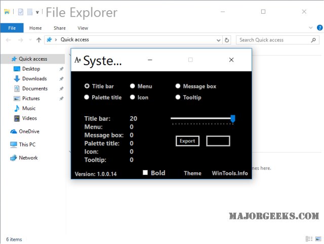 When you run System Font Size Changer, it offers to back up your current settings if you change your mind. You can also export these settings to another computer. Refreshing. You can also run the program in black or white backgrounds by clicking on "Theme" at the bottom.
