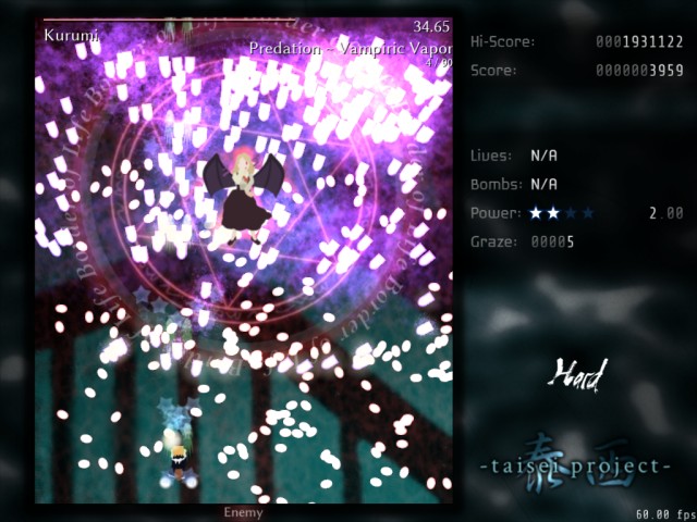 It is a shoot ’em up game with lots of bullets (the genre is called bullet hell). It doesn’t aim to rebuild a particular installment of the Tōhō games but is rather an original game set in the world of Tōhō. Enjoy dodging through 6 stages full of new bullet patterns on four difficulty levels.