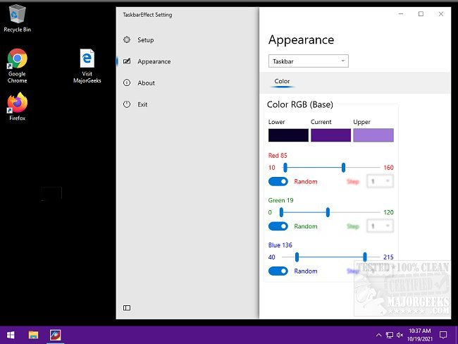 TaskbarEffectLT allows you to configure your current, lower, and upper taskbar colors; you can also set it to permit random color changes. Configuration is simple through its use of sliders for color manipulation.
