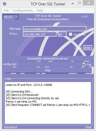 TCP Over SSL Tunnel is a free SSL tool with SNI Host (Spoof Host) support.