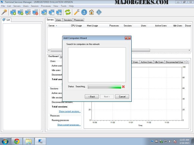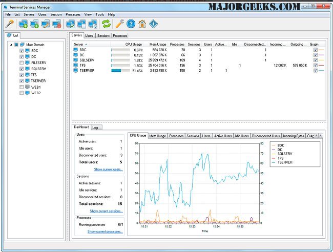 With LizardSystems Terminal Services Manager, you can send bulk messages to users, disconnect idle users, and simultaneously end the sessions of multiple disconnected users. Terminal Services Manager allows you to work with several hosts at once. It also displays information in both table-form and by drawing graphs of CPU usage, memory, and other resources over time for each server, session, and user.