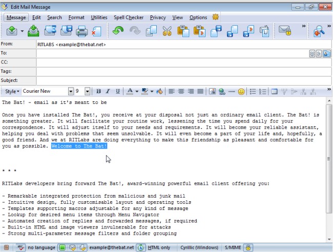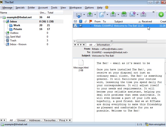 The Bat! Home Edition comes packed with a nice feature set that includes strong encryption, the ability to backup and restore, The Bat!’s own integrated address book, message parking, an internal HTML viewer as well as an image download manager for background retrieval of HTML images and an antivirus interface.