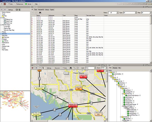The Dude will automatically scan all devices within specified subnets, draw and layout a map of your networks, monitor your devices' services, and alert you if a service has problems.