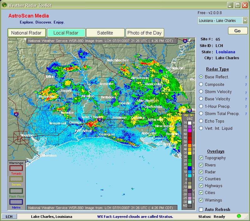 The Weather Radar Toolkit displays the national weather radar, local radar and satellite weather information for locations in the US including; Alaska, Guam, Puerto Rico and Hawaii.