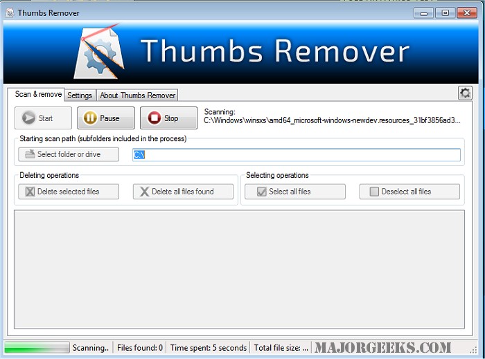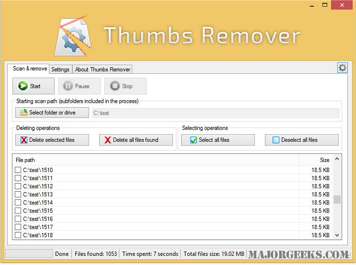 When you run Thumbs Remover, which can conveniently be integrated within the context menu of WindowsFile Explorer, it will quickly search for Thumbs.db files throughout all hard disks (internal or external), pen drives or in single folders and its subfolders; once the scan is complete you can browse through the list and decide for yourself which ones stay and which go.