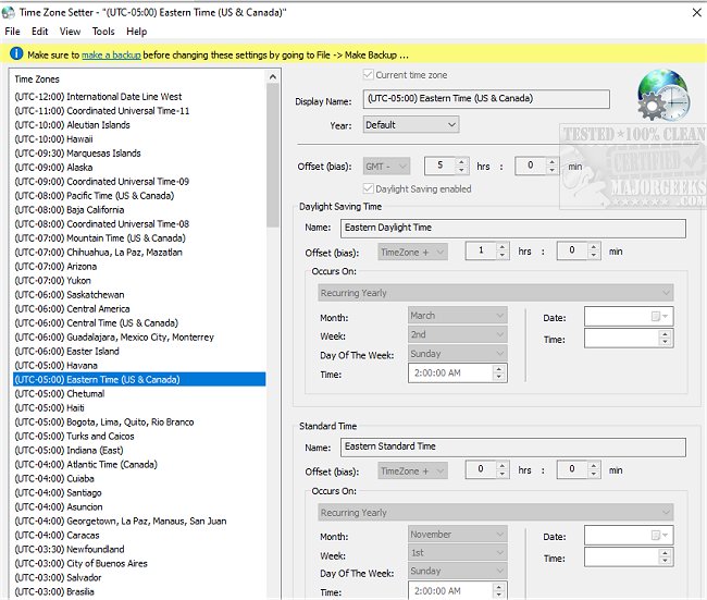 With this app, you can set the current time zone and adjust the time zone offset (or "bias") in minutes from the GMT or Greenwich Mean Time. You can also adjust daylight saving parameters for a time zone, such as when daylight saving begins and ends.