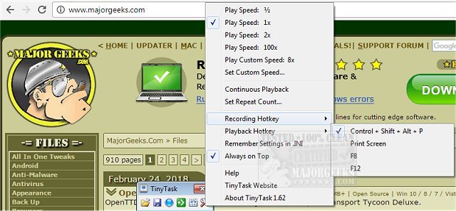 There is no significant configuration needed you just download and run it. Once you have run the program, you are presented with a tiny floating window that contains all that you need to begin recording your desktop activity. Other programs provide you with a description of a specific function when you hover its icon, TinyTask does not, but it isn't a factor because everything is pretty self-explanatory. The recording is seamless, and playback is equally so. It will play in fullscreen precisely as recorded and will perform tasks that have been recorded during the session. You do have some minor playback options like preset/custom speeds, continuous, and repeat. It can be set to record and playback via several predefined hotkeys as well as always on top so you can keep track of the very tiny window. All recordings can be saved to a location of your choice.