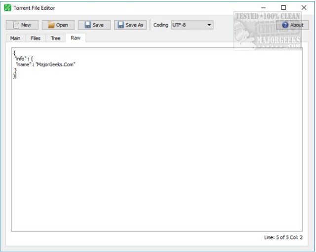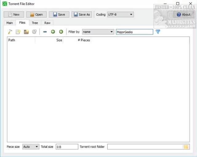 Torrent File Editor boasts a user-friendly layout that makes navigation a breeze. The top section features four tabs: Main, Files, Tree, and Raw. In the Main tab, you can input critical details such as name, URL, publisher, creator, creation date, private torrent, piece size, pieces, and hash. With the Files tab, you can add or remove files or folders and rearrange them as desired. You also have access to filters and the ability to calculate piece hashes. The Tree tab allows for the addition or removal of tree items, as well as the ability to move list items up or down and find or replace items. Finally, the Raw tab contains all your raw information.