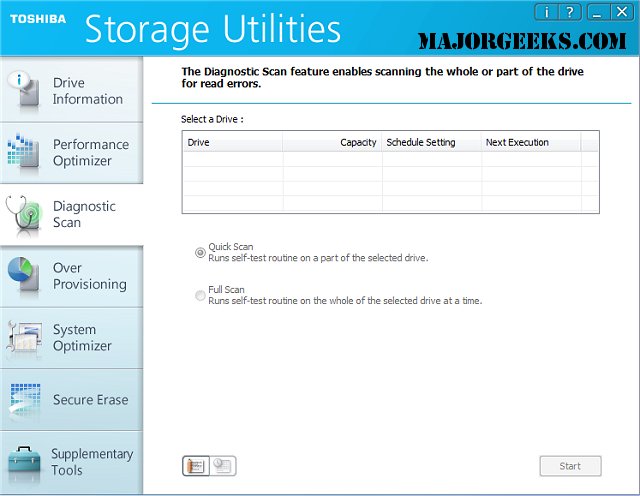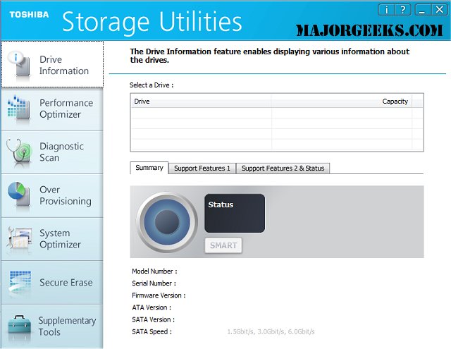 With this utility, you will be able to display pertinent drive information, optimize performance via the TRIM function, run error scans, securely erase, and reserve free space as well as system drive optimizations to enhance the performance of your Toshiba SSD.