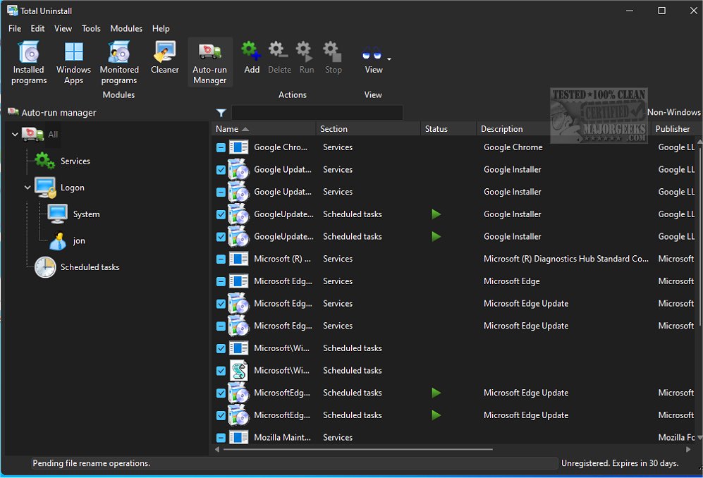 Total Uninstall, by default, creates a pre-install snapshot of your system and then takes an additional snapshot after the installation has been completed. It will then compare those two snapshots and display any changes made, marking all registry values and files that have been deleted, added, or changed. It saves them, so if you decide to uninstall the program, it can reverse the changes to the previous state.