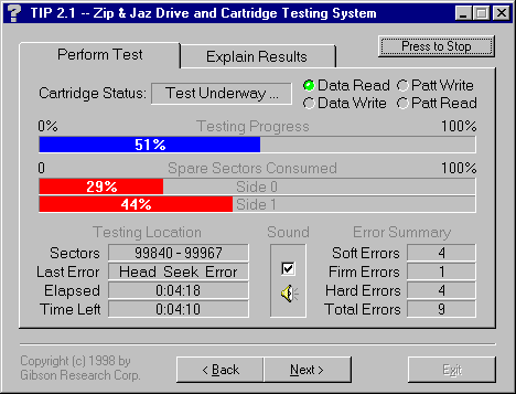 Iomega ZIP and JAZ drives suffer from a head positioning problem (servo stiction) that can actively and permanently damage perfectly good ZIP and JAZ drive media. TIP (Trouble In Paradise) provides an early warning system when a user's drives are beginning to damage its media.