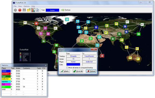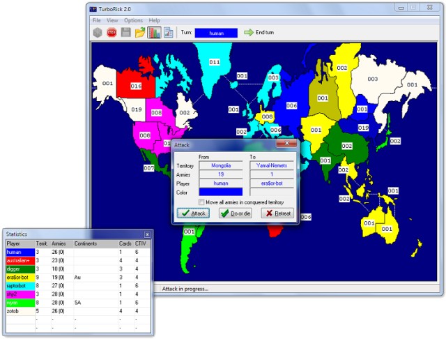 TurboRisk is the classic "World Domination Risk" game, where you are battling to conquer the world.