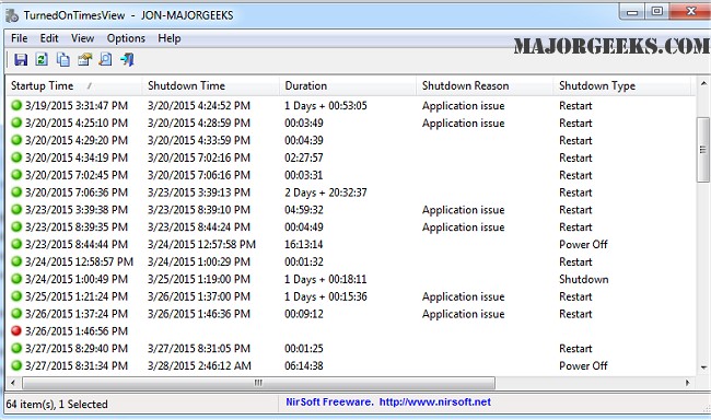 For every period of time that the computer was turned on, the following information is displayed: Startup Time, Shutdown Time, Duration, Shutdown Reason, Shutdown Type, Shutdown Process, and Shutdown Code.