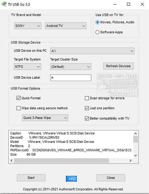 Using TV USB Go is easy, the user interface is intuitive and straightforward. Select the correct TV brand and exact model followed by the USB drive that you wish to format. From there, you will choose a cluster size (the bigger, the better) and click the start button. The process should only take a few seconds to format the USB drive.