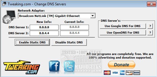 Tweaking.com - Change DNS Servers comes in a simple interface that makes the modification simple and easy for any skill level of user that would like to change their DNS servers. It also identifies and lists your system's network adapter as well as offering options to enable/disable static DNS.