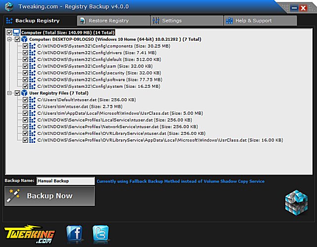 Tweaking.com - Registry Backup is a backup tool that uses the Windows Volume Shadow Copy Service to backup your system registry. From the author of Tweaking.Com - Windows Repair.