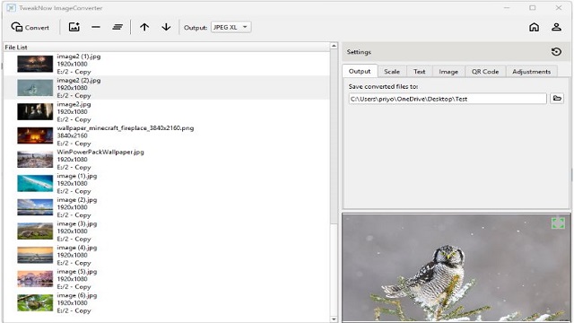 TweakNow ImageConverter keeps it simple with a single-window interface. You drag in files or folders, pick output settings, queue optional enhancements, and run. It supports modern formats, such as AVIF, JPEG XL, and HEIC, alongside classics like JPEG, PNG, and GIF. Watermark options include text, image overlays, or embedding a QR code. You can resize by percentage or to exact dimensions.