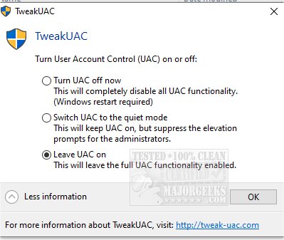 TweakUAC can quickly turn UAC (User Account Control) on or off or make UAC operate in quiet mode.