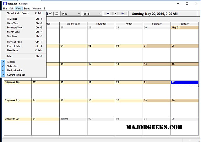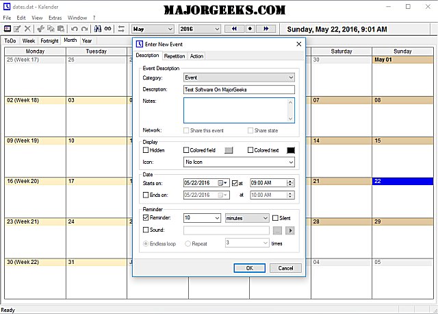 Of course, it has since expanded and now has many features including automatic saving, unlimited Undo and Redo, network support, repeating events, forewarn time and snooze function, multi-day events, event categories and templates, search and filter functions, export to HTML- and CSV-format, and much more