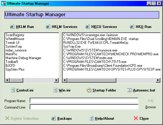 There are actually 7 ways a program can be set to run at Startup, not just 3 as most other programs allow for. Some can be set by malicious web sites such as changing your Start and/or Search Page to theirs and adding a small program that will change it back to theirs whenever you change it back to yours. Additionally many will disable some of your options such as Internet Settings to prevent you from changing it. There are also many programs that use unnecessary resources and really have no need to run ad and disable these programs. Any Registry item disabled is automatically backed up for easy one click restore.