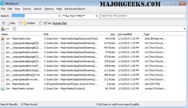 UltraSearch finds files and folders on local NTFS drives and provides the results in just a few seconds.