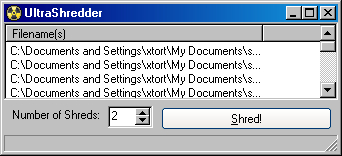 UltraShredder deletes sensitive files by overwriting them with random characters, saving it to disk each time, and then bypasses the recycle bin, thus acting as your personal, portable file shredder. If the file were to be recovered by a data recovery program, they would only be able to see unintelligible characters on disk where the file used to be. The program is a great tool to destroy sensitive data, and is very small with a minute memory footprint, and makes no changes to your system whatsoever.