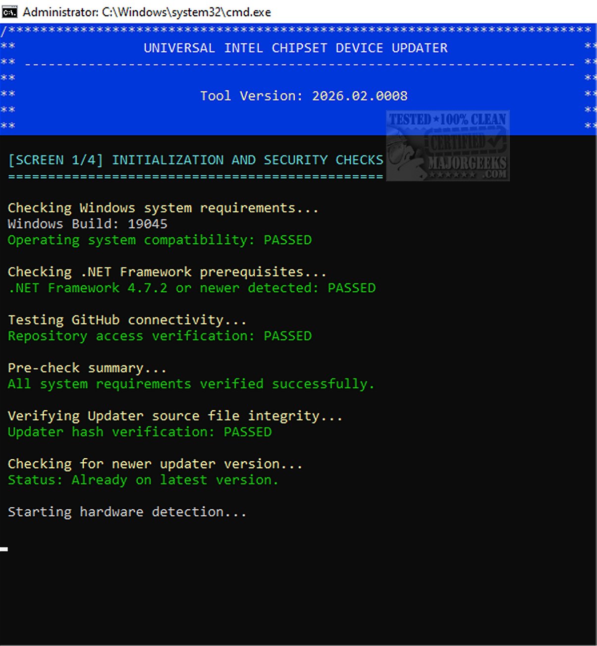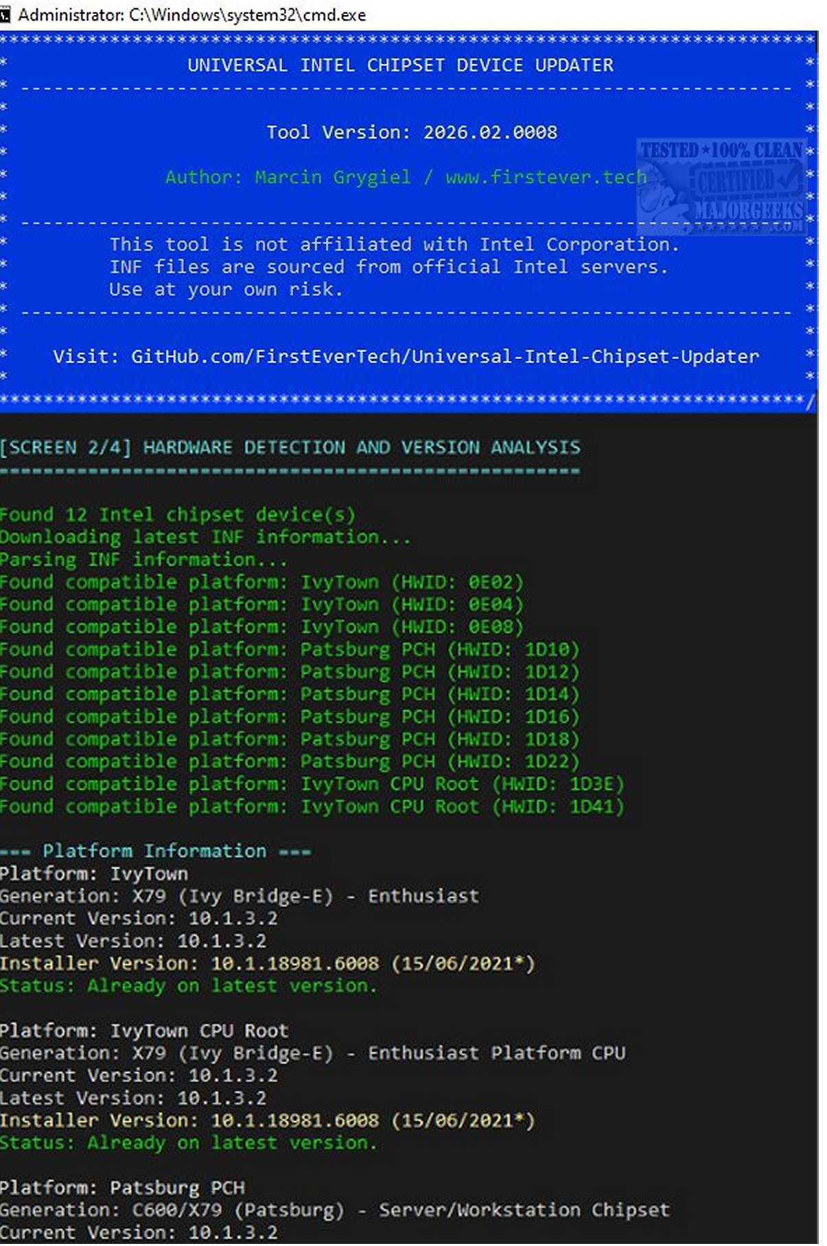Universal Intel Chipset Device Updater improves detection of Windows Inbox INF files, preventing accidental downgrades when Windows Update offers driver versions newer than those provided by Intel. This update enhances the version comparison logic and introduces clearer status messages, while also preserving all the hardware-accurate platform detection features from earlier versions.