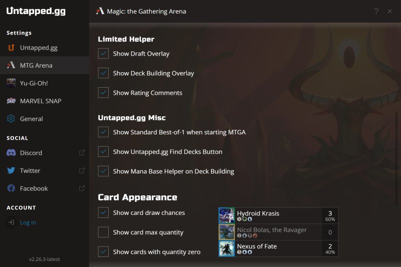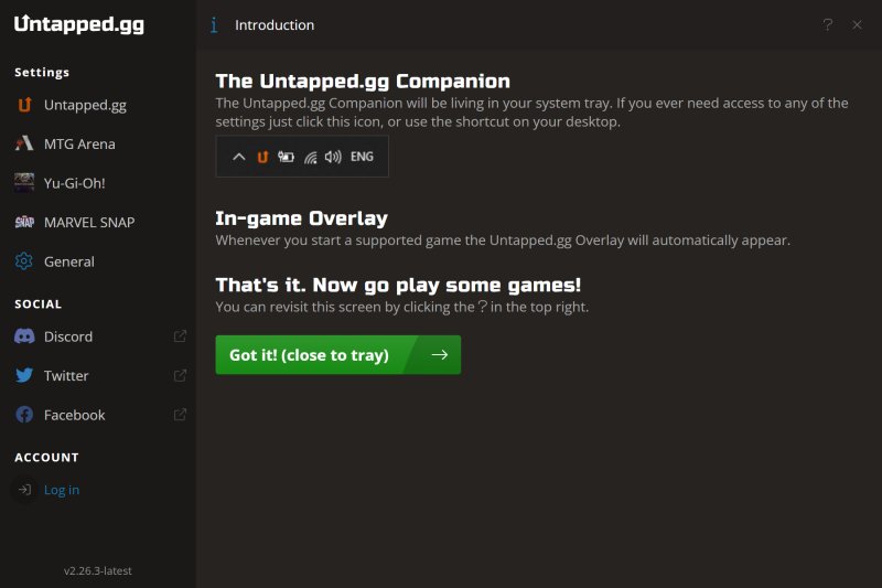 Untapped.gg Companion is a companion app for MTGA that provides detailed analytics, real-time insights, and tools to help players improve their skills and deck performance. It integrates directly with the MTGA client to track matches, display deck details, and offer meta-based recommendations. This app is especially valuable for players looking to climb the ranks or stay competitive in a constantly shifting meta.