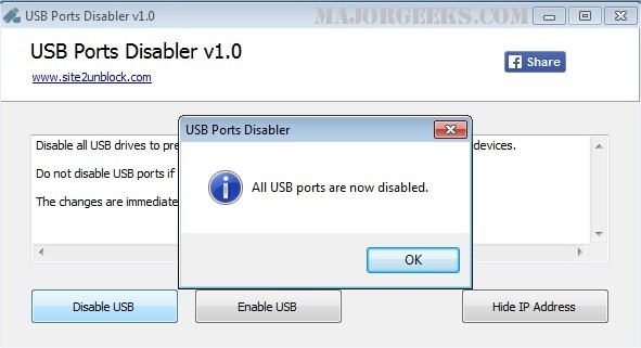 The disabling of the ports is intended to prevent data theft and malware which can be spread easily through USB devices. The simple UI allows single click locking or unlocking of USB ports, which effectively restricts users from using USB drives on your computer, as well as disabling the USB drive detection on your Windows system.