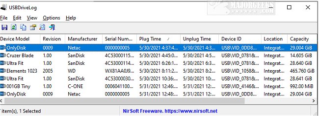 For every USB drive event, USBDriveLog organizes and displays the following data: Device Model, Revision, Manufacturer, Serial Number, Plug Time, Unplug Time, Device ID, Device Capacity, and more.