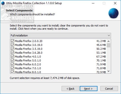 The installation allows you to select any version of Firefox, Firebug, and Web Developer you like. By default, all versions will be installed. Note that this isn't every version but rather the last stable version. For example, if you want to install 2.0, it will only install 2.0.0.20, the final stable release of the 2.0 versions. Note that you can use over 7GB of space installing everything. Installation can take ten minutes or more if installing everything on a fast computer.