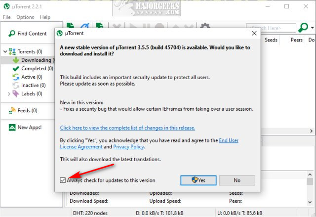 Once installed, uTorrent will check for updates. Uncheck the box to check for updates or you will be nagged repeatedly.