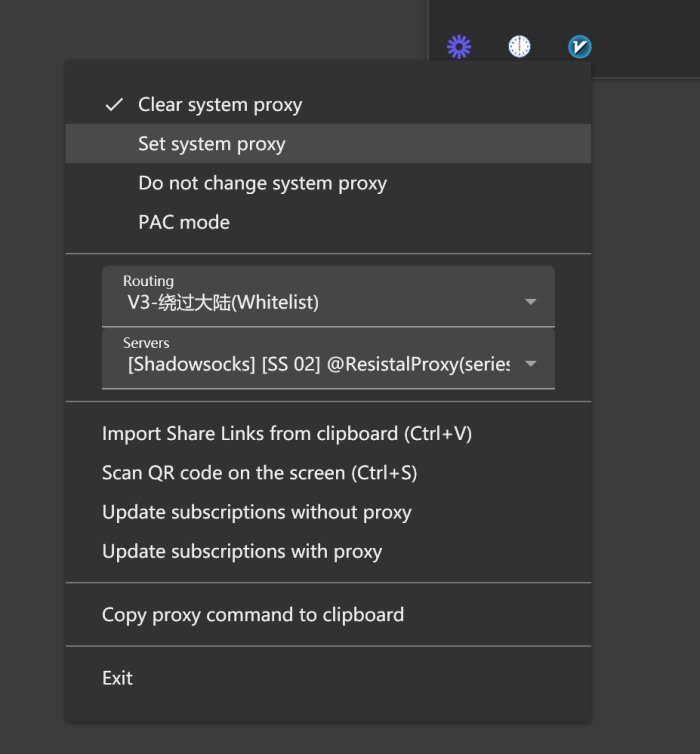 Click on the server you want to connect to, and a checkmark will usually appear next to it, indicating it's selected. To activate the connection, right-click the V2RayN icon, navigate to the âSystem Proxyâ option, and choose either "Global Mode" to route all traffic through the proxy or "PAC Mode" to route only specific traffic based on rules.