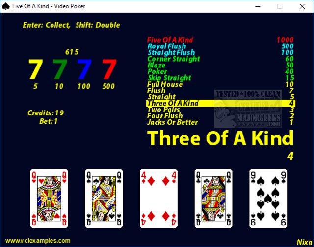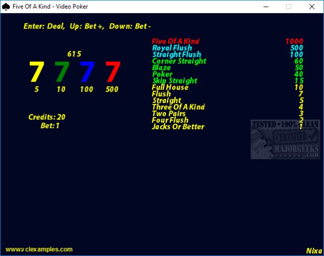 VCL Video Poker is very small and requires installation. Overall the graphics are bright and straightforward, and the game is easy to play. Enter will deal cards, and a click of the mouse decides which card(s) to save. The up and down arrows also change your bet. Because the mouse is used, it's not as intuitive as we like. A Deal button would work here so that you're not going between the mouse and keyboard. The enter key is also used to collect or double down.