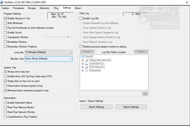 Venmon's UI is broken down into two different displays: a mini window and the main window. The mini window is a super-compact display of all details that can float on your desktop in any position. To call up the main (or big) window, double-click on the mini, and the main window will be displayed. The main has several tabs representing different areas of interest. These tabs include system, processor, networks, ping, and settings. All of these provide in-depth details about the category they represent.